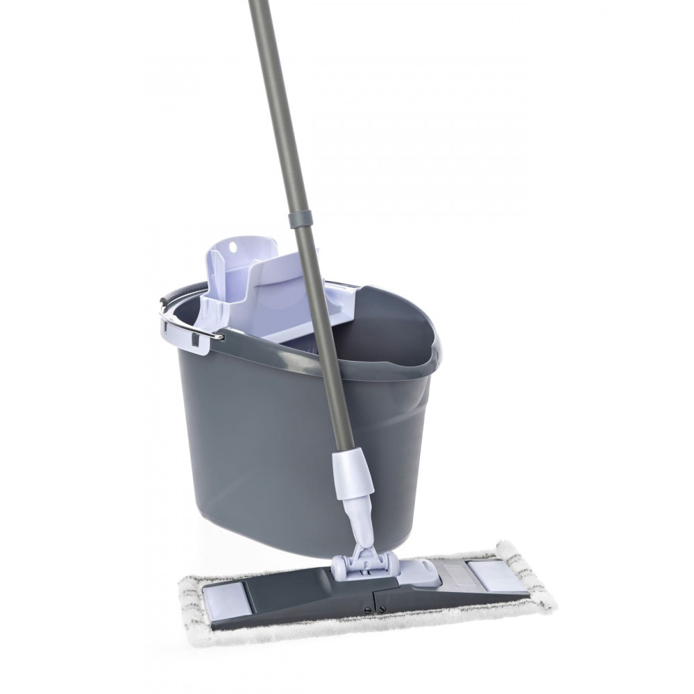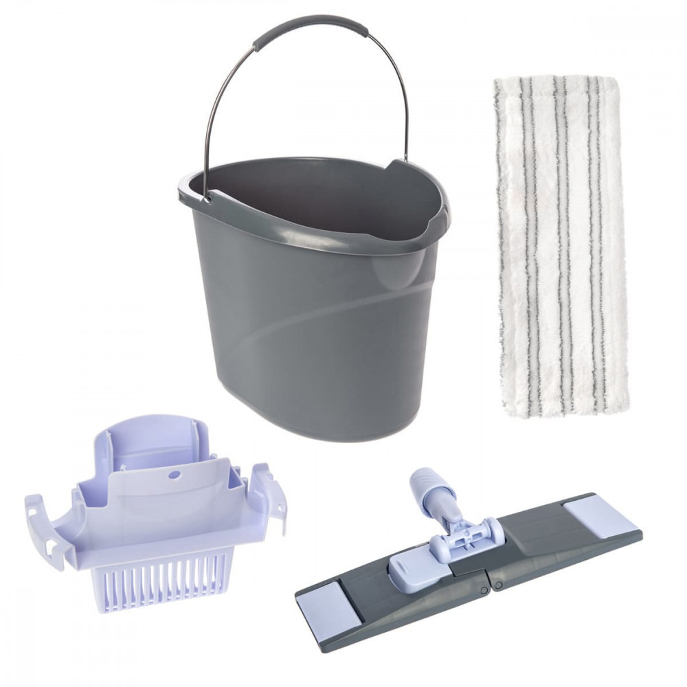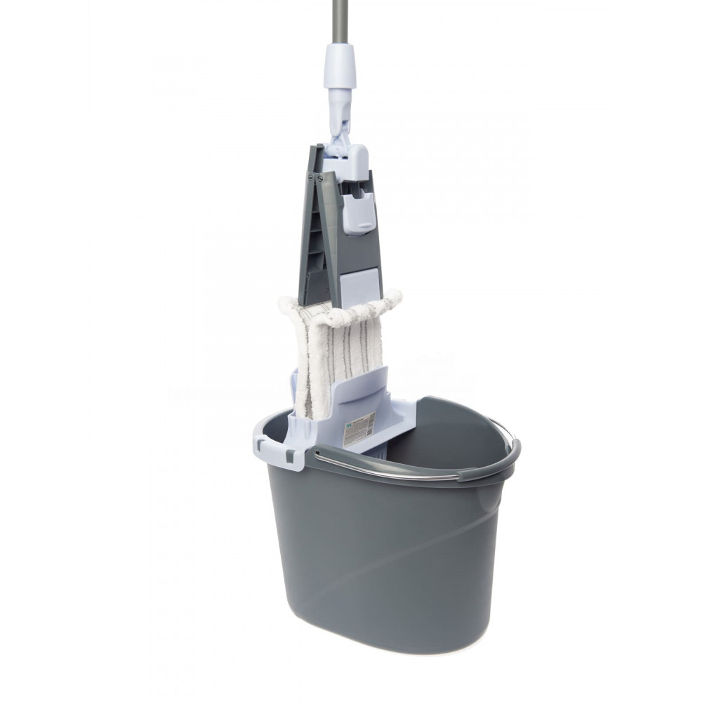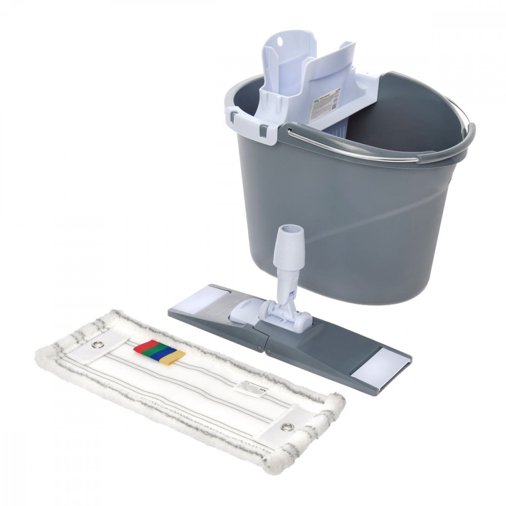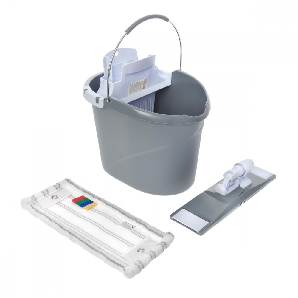 В состав набора входит ведро (10 литров), туннельный отжим, моп из микроволокна, держатель мопа.